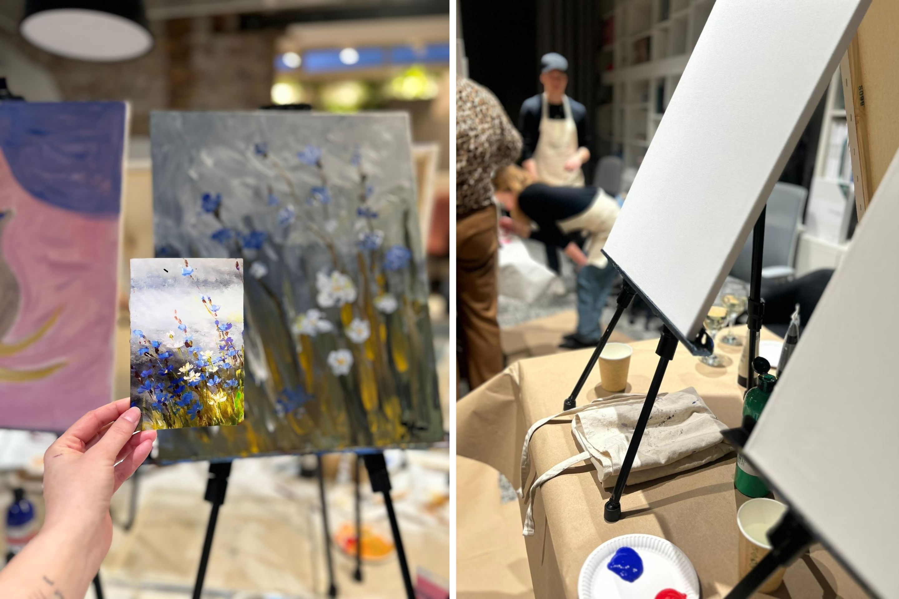 In November, our showroom at Browarna 4 in Warsaw hosted an intimate meeting for architects as part of the Hoof Meet-Up series. This was another event where we invite architects and other design professionals to creative workshops, sharing experiences, ideas, and the latest trends in architecture and design. Participants of this edition took part in a painting-with-wine workshop – a format that offered a break from the daily work pace and a chance for free artistic expression. Everyone could create their own canvas and let their imagination flow. Beautiful artworks were made during the session, and participants took their creations home – who knows, some of these pieces may end up in special places in their homes.